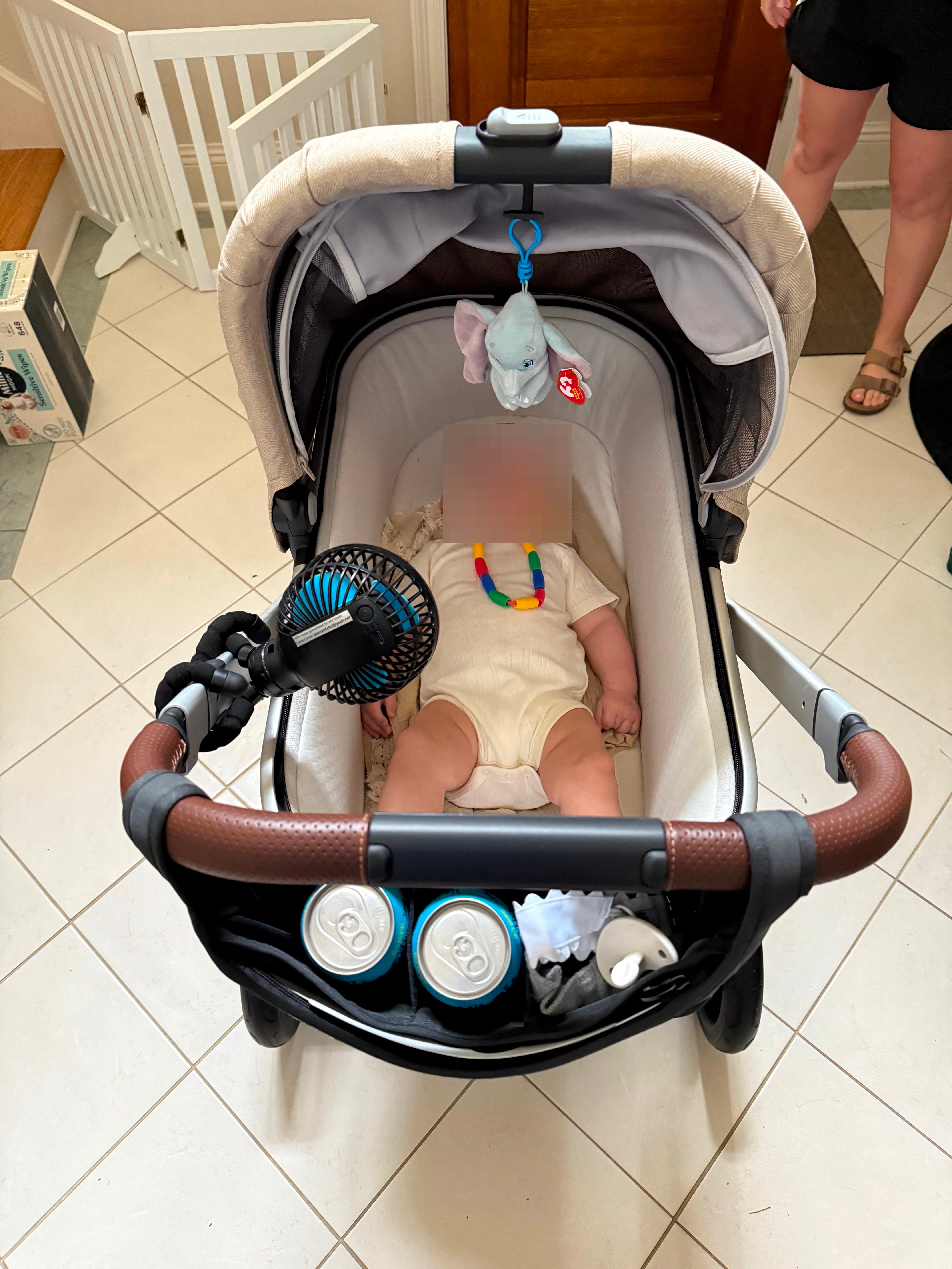 Absolute game changer for Southern heat. I clip it to the bar or canopy and point it toward the baby. Keeps them cool and content on walks.